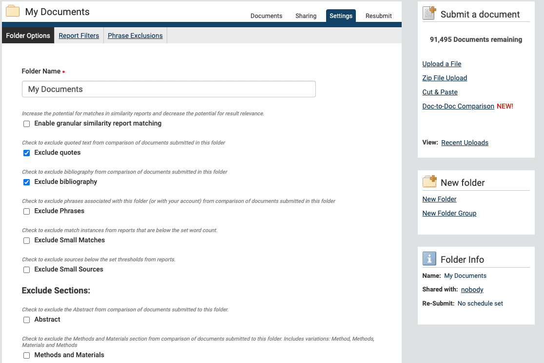 The exclusion option allows you to exclude quoted material or bibliographic material that does not need to be checked. It also allows researchers to exclude small matches below a certain word count. If you want to exclude certain sections, such as an abstract or a methods and materials section, it is as simple as checking a box next to the section you want to exclude.