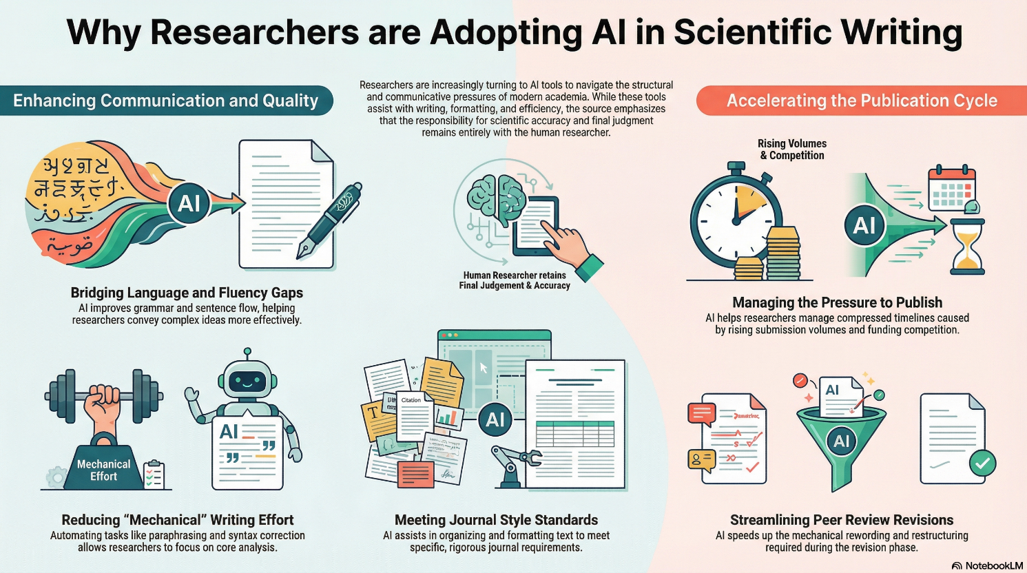 AI adoption in research writing is no longer marginal. A 2025 analysis of AI use in academic writing revealed that among researchers who reported using AI tools for manuscript preparation and language editing, 51% used them to improve readability, while 22% relied on them to check grammar. Furthermore, a study published in Nature Human Behaviour that analyzed more than 1.1 million preprints and published papers across platforms such as arXiv, bioRxiv, and Nature journals found that of the presence of large language models (LLMs)-modified content has steadily increased. By late 2024, evidence of LLM‑modified content has reached approximately 22% in some fields (e.g., computer science). These findings show that AI-assisted manuscript preparation is becoming increasingly common across research disciplines.